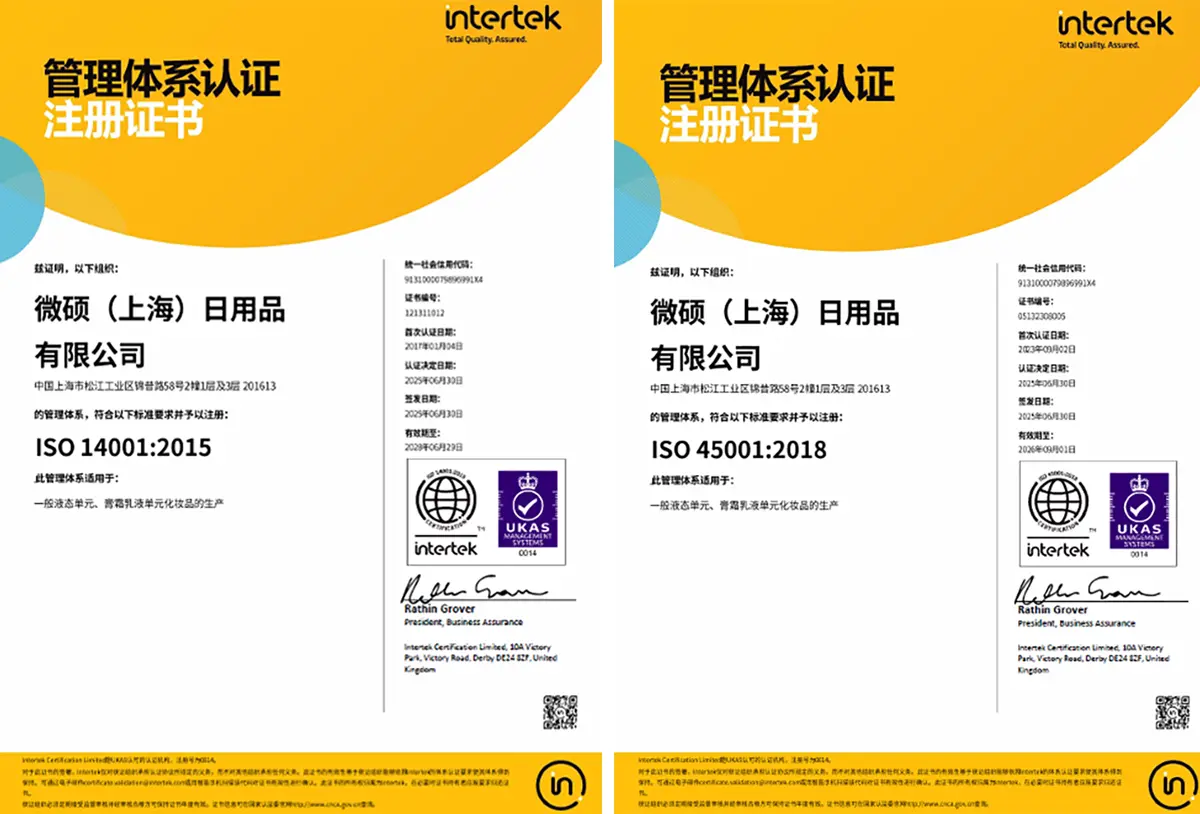子公司暨供應鏈-微碩(上海)日用品有限公司於2017年 1月取得 ISO 14001環境管理系統首次認證,2025年6月取得再次認證;2023年7月取得ISO45001職業安全衛生管理系統首次認證,2025年6月取得再次認證。